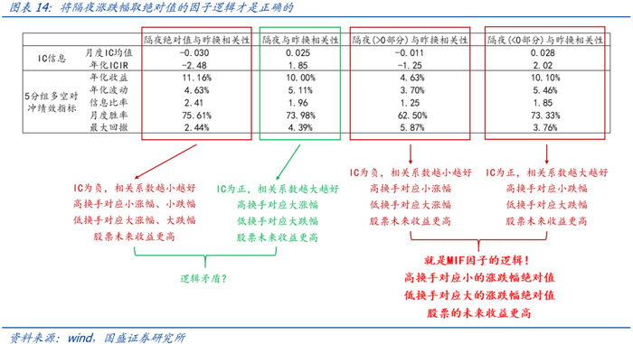 在不取绝对值的情况下,因子的IC为正,这就代表因子的选股逻辑为:隔夜涨跌幅与昨日换手率的相关系数越大,股票的未来收益越高;即在过去一段时间中,昨日高换手对应隔夜大涨幅、昨日低换手对应隔夜大跌幅,这样的股票未来收益更高。回顾原报告中MIF因子的IC为负,由于计算的是隔夜涨跌幅绝对值与昨日换手率的相关系数,因此原来因子的逻辑为:隔夜涨跌幅绝对值与昨日换手率的相关系数越小,股票的未来收益越高;即在过去一段时间中,无论隔夜上涨还是下跌,昨日高换手对应隔夜小涨幅、小跌幅,昨日低换手对应隔夜大涨幅、大跌幅的股票未来收益更高。如此一来,撤掉绝对值之后的因子逻辑,就与原来因子的逻辑产生了矛盾,究竟谁对谁错?