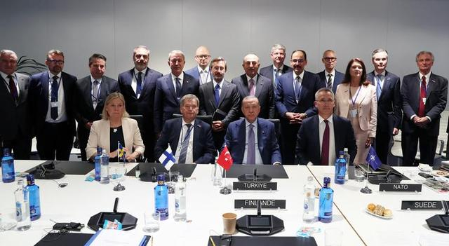 当天,三国政府首脑在与北约秘书长斯托尔滕贝格进行谈判后宣布了这一决定。现场,土耳其外长恰武什奥卢、芬兰外长哈维斯托和瑞典外长安·林德签署了三边备忘录。土耳其总统埃尔多安办公室的声明称,土耳其“得到了想要的东西”。