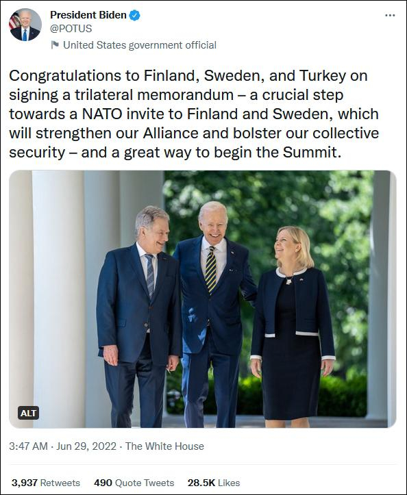 “深藏功与名”的拜登很快也在推特上贺喜:“祝贺芬兰、瑞典和土耳其签署三边备忘录——这是北约邀请芬兰和瑞典的关键一步,这将加强我们的联盟并增强我们的集体安全——也是峰会开始的一个好方式。”