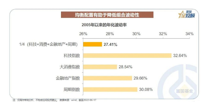 “一个简单的策略是,把握适度均衡的艺术。自2005 年以来,相比单独配置科技、消费、金融地产 、周期指数,若是采用均衡配置四大指数的方式,组合波动性会有明显的下降。”富国基金说。