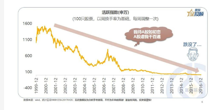 其次,坚持基本面投资,狂追热点不靠谱。申万活跃指数是以周换手率为基础,每周会选最活跃的100只股票,也代表“追热点”的投资方式。从2000年到2017年初,这个指数“跌没了”。