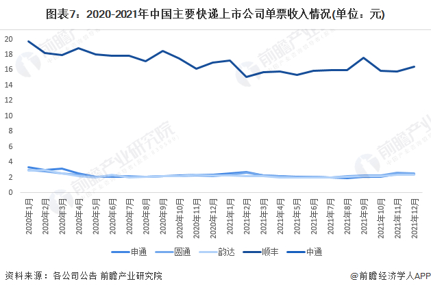 从快递单票收入来看,2020-2021年,我国主要快递上市公司单票收入呈波动下降的趋势,行业价格战较为激烈。2021年,顺丰快递单票收入最高,达到16.43元;圆通速递、申通快递、韵达股份次之,单票收入在2.5元左右;中通快递单票收入最低,仅为1.39元。