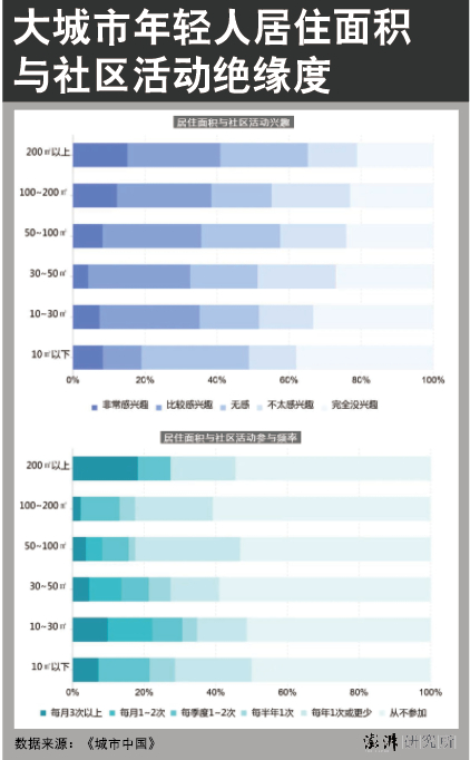 而根据《城市中国》2021年的调查结果,租房(含宿舍)群体参与社区活动与买房相比出于两极分化的状态,高频率与完全不参加均更多,而如果不是单位学校宿舍这种熟人社区,以陌生人社区构成的租房群体对社区活动更不感兴趣;居住面积越大和越小越表现出对社区活动的兴趣,但参与频率则难以找到规律。