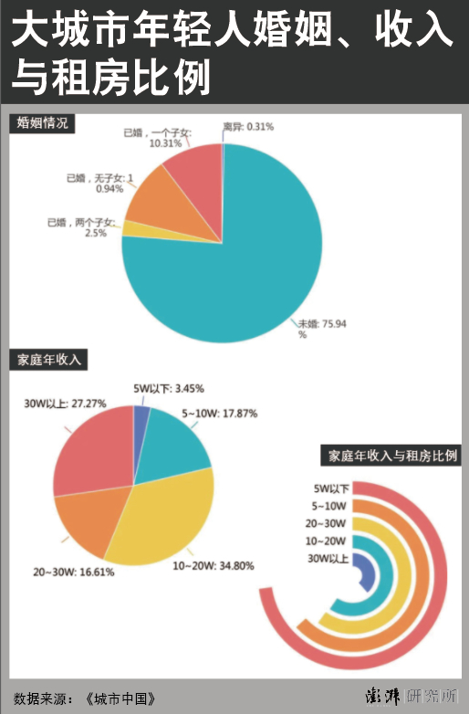 而在2021年夏,《城市中国》杂志也通过调查问卷的方式描绘出中国居住于一线城市的年轻人(其中50%为26-30岁,30%为31-40岁,18-25岁约20%)在婚姻、收入、租/买房偏好的特点,最终也得出了类似的结论。