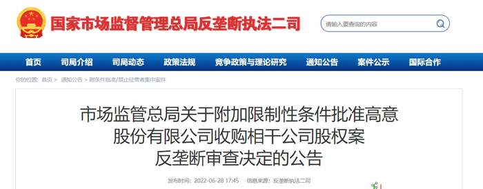 市场监管总局关于附加限制性条件批准高意股份有限公司收购相干公司股权案反垄断审查决定的公告