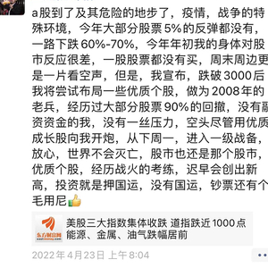 钟格:首先我是6成仓位,手上还有现金流;其次,我是自有资金,无融资,无配资,没有外在压力;再者,我对自己的持仓比较自信,也相信国运,只要是好公司,肯定会再涨回来。