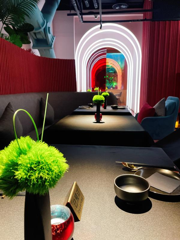 中午12时左右,醉东港汇恒隆广场店外已经有了几组等位的顾客,大家或坐在等候区,或就近站在店外公共区域,彼此保持着友好的社交距离。餐厅内,虽然顾客上座率已经满座,但实际上仅开放了餐厅原来一半的座位。桌上摆放了餐具的是可用餐区,用一束玫瑰花代替餐具的桌子则是专门留出的“间隔区”。
