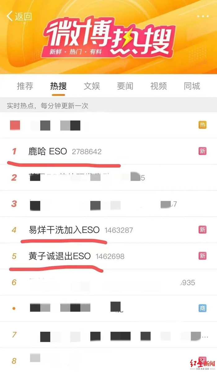 6月29日,“黄子诚退出ESO” “鹿哈 ESO” “易烊干洗加入ESO”等词条频上热搜,“ESO男团”引发网友关注。