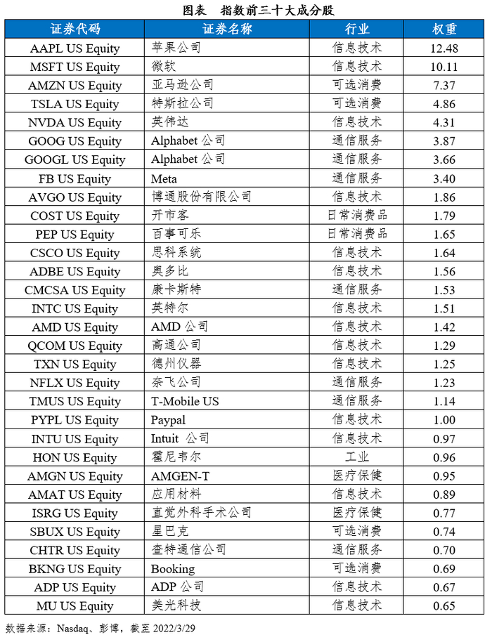 截至2022年3月29日,纳斯达克100指数实际成分股数量为102只。成分股权重最大的公司是苹果公司,权重为12.48%。前五大成分股权重之和为39.12%,前十大成分股权重之和为53.71%,前二十大成分股权重为67.93%。纳指100中科技股的权重长期稳定在50%以上,成份股中包含苹果、微软等众多顶尖的科技公司。