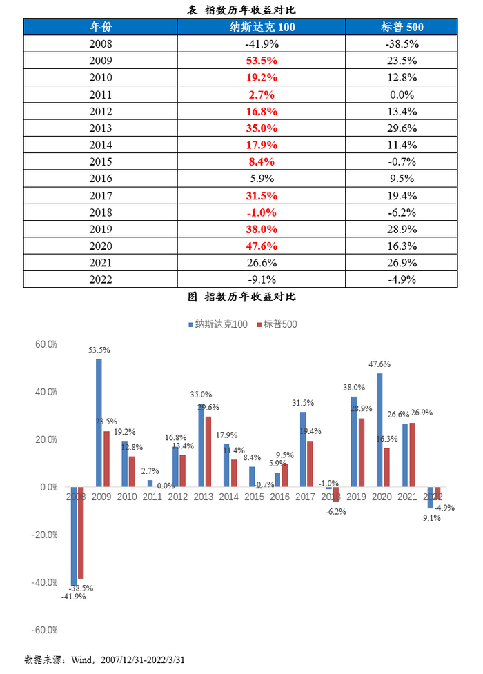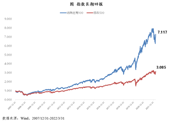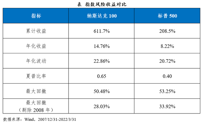 自2007年底至2022年3月底,纳斯达克指数累计收益达到611.7%,年化收益14.76%,均大幅领先于同期标普500指数的208.5%和8.22%,纳斯达克100指数的累计收益已经接近标普500指数的3倍,年化收益领先6.54%,指数长期回报占据绝对优势。对比风险类指标,纳斯达克100、标普500的年化波动率为22.86%、20.72%,波动率水平非常接近,纳斯达克100指数略高,指数在实现长期回报的同时并没有带来更高的风险。最大回撤方面(含2008年和不含2008年),纳斯达克100指数均低于标普500指数,尤其是去除2008年后最大回撤28% vs 34%。总结来看,纳斯达克100长期收益突出,波动率相近,风险控制能力更好,具备更好的风险收益特征(夏普比率0.65 vs 0.40)。