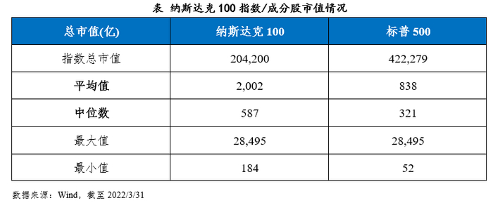 从成份股市值上看,截至2022年3月底,纳斯达克100指数总市值20.42万亿美元,成分股总市值平均值为2002亿,中位数为587亿,最小值为184亿,符合其板块大盘、科技龙头指数的定位。对比标普500,成分股整体市值上纳斯达克100更领先。从市值分布来看,纳斯达克100主要集中在1000亿以上和300-700亿,标普500集中在1000亿以上和100-500亿,主要是由于500-1000亿市值公司整体数量不占优,指数成分股较多时会在内部形成市值两极分化。