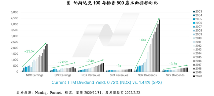 尽管经历过2008年的金融危机,经济波动性也逐步加强,但纳斯达克10指数在过去近20年实现了巨大的基本面提升,收入、利润、分红从2003年到2020年实现了23.5倍、7.4倍、44倍的增长,对比与标普500仅有2.85倍、2倍和3.5倍。年化层面,纳斯达克100指数实现每年20%的收入增长、12%的利润增长、25%的分工增长以及7%的估值下降。收入的增长体现出在波动经济中公司逐步发展成熟,利润增长表明公司可以控制成本。这些基本面数据是纳斯达克100指数能够战胜美国各类大盘指数的重要原因。