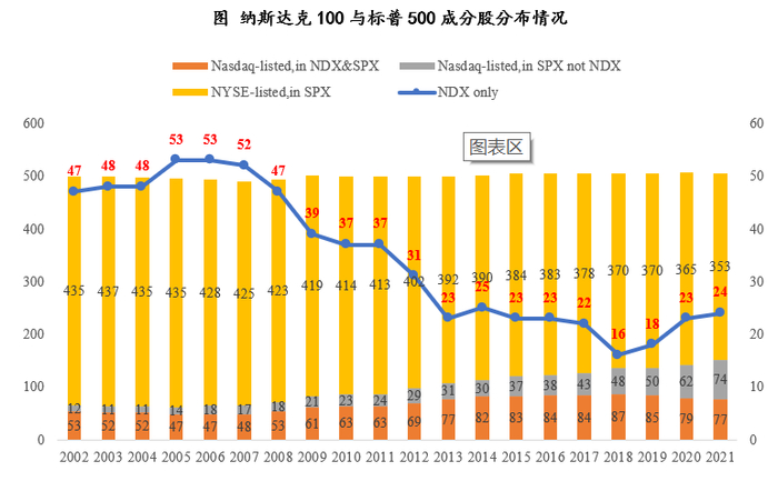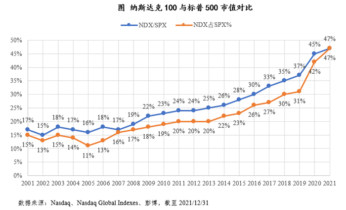 对比近20年纳斯达克100与标普500成分股的演进,标普500越来越多的纳入纳斯达克上市的股票,两个指数的交集也呈现增长的趋势,但近几年有所下降,2021年纳斯达克100指数有24家公司并不在标普500指数中。与此同时,尽管有成分股数量差距,纳斯达克100指数/标普500的市值比呈现逐年上升的趋势。在标普500内部,纳斯达克100成分股对标普500市值的贡献也逐年提高,两个比例目前已经达到47%的较高水平,体现了纳斯达克100指数的积极发展趋势和指数代表性的增强。