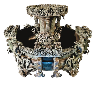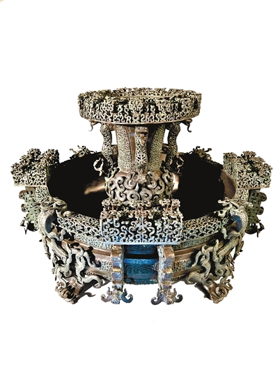 特点:曾侯乙尊盘为春秋战国时期最精美的青铜器,中国首批禁止出国(境)展览文物,1978年在湖北省随州市擂鼓墩曾侯乙墓中出土。这件尊盘的惊人之处在于其鬼斧神工的透空装饰。装饰表层彼此独立,互不相连,由内层铜梗支撑,内层铜梗又分层联结,参差错落,玲珑剔透,令观者凝神屏息,叹为观止。