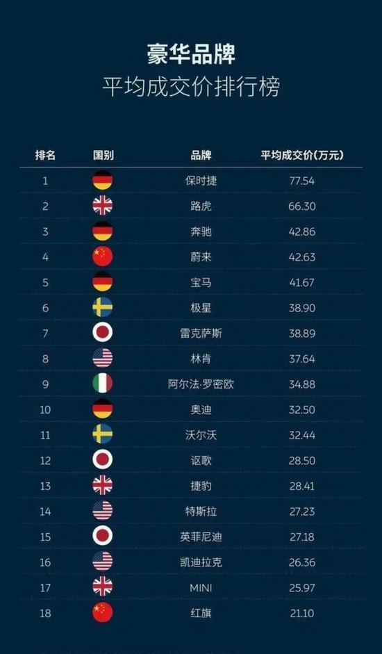 根据汽车产业数字化应用平台——威尔森发布的2021豪华汽车品牌平均成交价排名,在中国拥有广泛群众基础的奔驰、宝马和奥迪均价分别为42.86万元、41.67万元和32.5万元,位列第三、第五和第十。