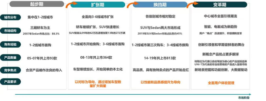 第二阶段内,中国社会迎来了40多年来经济不可复制的高增长,随之而来的是财富效应,在汽车普及的过程中换购升级的迹象十分明显,尤其是在北上广深等一线城,四五六线城市则是首购,对低端市场的贡献较为明显。