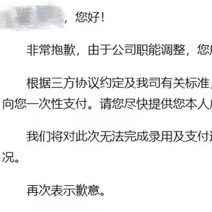 “非常抱歉,由于公司职能调整,您应聘的岗位职能被合并,无法推动录用流程,无法按之前的录用通知及三方协议与您签订劳动合同。”该公司在解约邮件中写道。