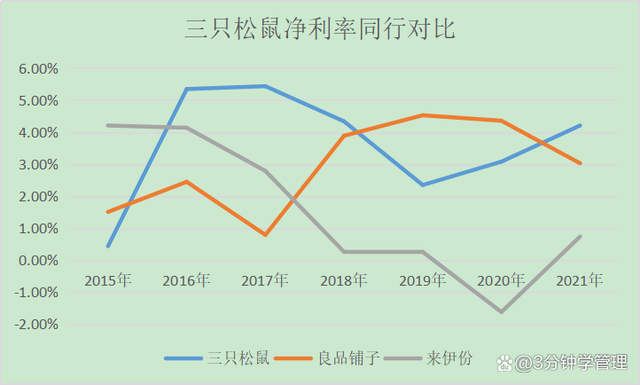 在同行中,近几年三只松鼠在营收和净利率方面的表现并不佳。