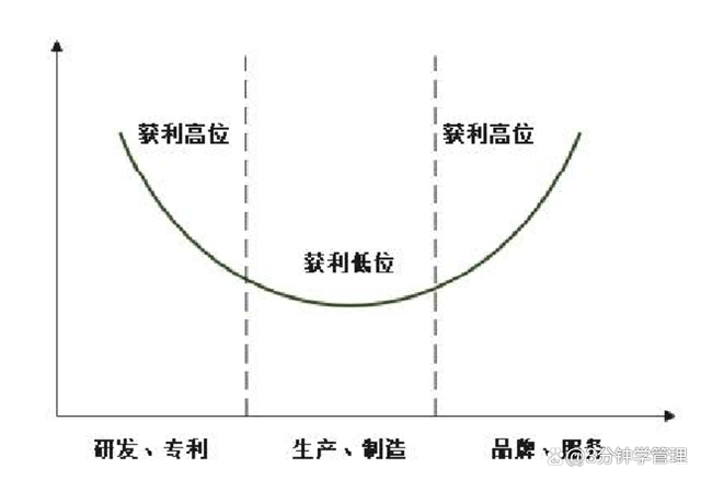 这是基于微笑曲线理论的,良好的走向应该是这样:左端加强研发,右端加强以客户为导向,注重营销和服务,产出高附加值的产品和服务才能具有较高的盈利潜力,确保公司可持续经营。