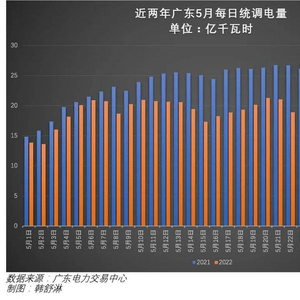 2022年5月,全国第一经济大省和用电量第一大省广东的用电量出现了罕见的两位数降幅。