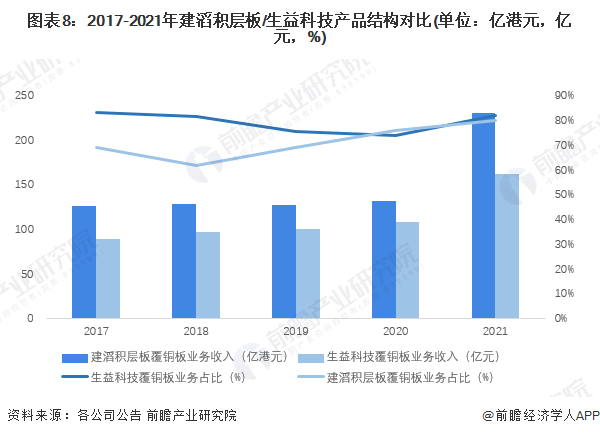 从两家公司的营业收入来看,2017-2021年建滔积层板的营业收入呈现波动态势,2021年为288亿港元(折合人民币约237亿元);生益科技呈现逐年上涨趋势,2021年营业收入为202.74亿元。建滔积层板2021年经营业绩更好,生益科技也在不断提升。