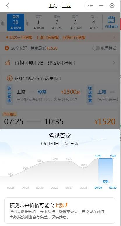 航班管家数据显示,过去一周,上海至三亚航班最低价格一路上涨,目前已由6月23日的586元上涨至6月29日的1520元,涨幅超过150%。