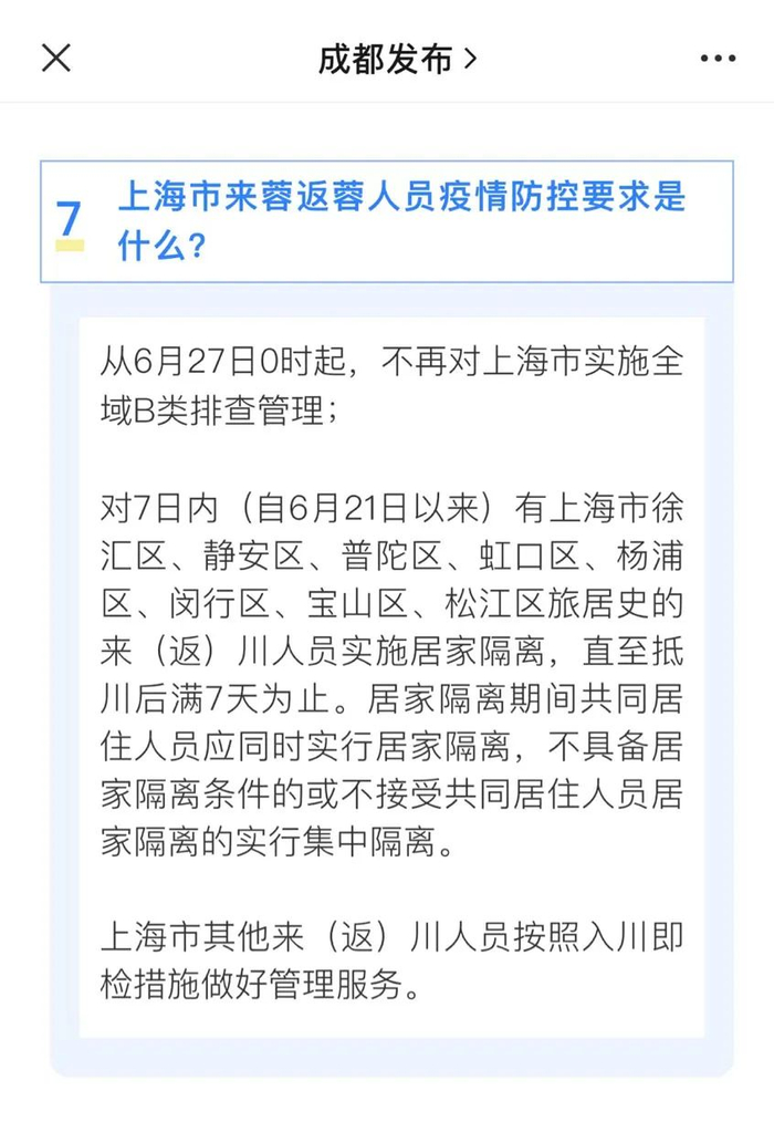 据成都发布微信公众号6月26日消息,从6月27日0时起,成都不再对上海市实施全域B类排查管理。只对7日内(自6月21日以来)有上海市徐汇区、静安区、普陀区、虹口区、杨浦区、闵行区、宝山区、松江区旅居史的来(返)川人员实施7天居家隔离。据此,上海其他区游客进入成都无需隔离。