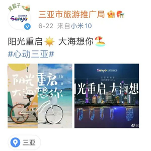 “阳光重启,大海想你”。6月22日,三亚市旅游推广局发布两张上海三亚双城联动海报,回应近期上海游客热情。