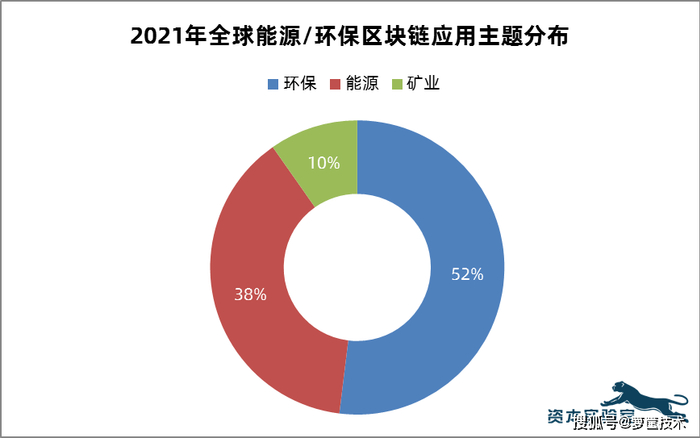 据资本实验室不完全统计,2021年全球能源/环保区块链应用案例数量达到154起,占区块链应用案例总数的12%,是除了金融行业外,应用活跃度最高的行业。其中,环保主题应用占比最高,达到52%;其次是能源主题(38%)与矿业主题(10%)。