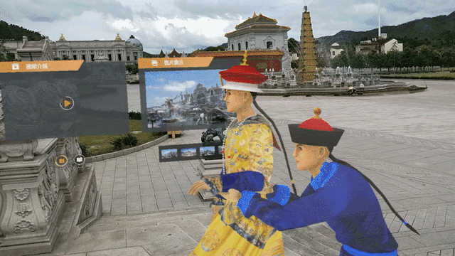 除了实用信息服务,“元宇宙旅游”还很适合展示与景点相关的历史场景。去年,亮风台联合另一家科技公司与横店圆明园合作,让游客戴上AR眼镜,在游览圆明园时观看一幕幕历史场景:皇帝与仆从一起观水法(喷泉),英法联军火烧圆明园……配上语音讲解,给人们带来“穿越”体验。在黄花阵迷宫中,戴AR眼镜的游客还能玩“迷宫寻宝”游戏,闯关成功就会获得奖励。