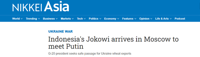报道说,佐科30日开启的访俄之行旨在促成俄乌和平谈判,并讨论全球粮食危机。
