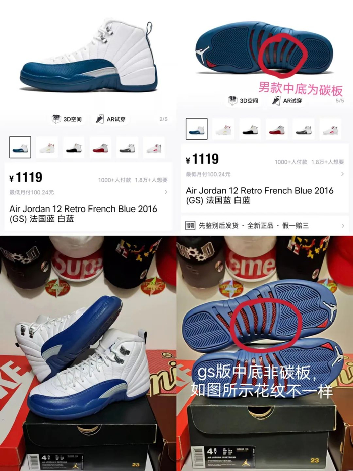 得物平台上架的aj12法国蓝gs图文不符,图片来源:得物、instagram