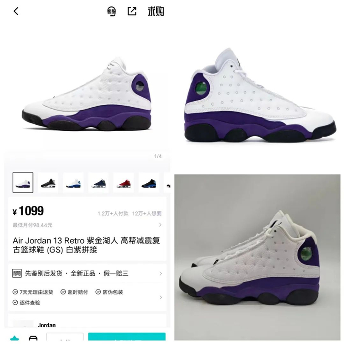 得物平台上架的aj13 court purple gs图文不符(左图为男款,右两图为gs),图片来源:得物、eBay