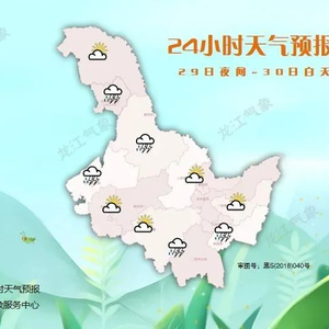 29日夜间到30日白天:大兴安岭南部、黑河、齐齐哈尔、哈尔滨东部、七台河、鸡西、牡丹江多云有雷阵雨,其中哈尔滨东部、牡丹江局地有中雨,其它地区晴有时多云。