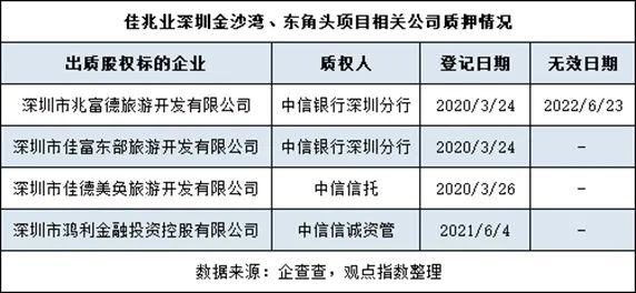 而在佳兆业金沙湾项目信托成立前一星期,即2020年3月26日,佳德美奂已将股权质押予中信信托;另外两家开发主体兆富德旅游、佳富东部,则出现股权质押予中信银行的情况。一般情况下,房企寻求银行贷款或非标融资时,还款来源主要是销售回款或经营收入,以及抵押物的变现收入。