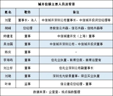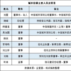 实际上,城开信银的9名主要董监高人员,除了刘星、胡峰以外还有3人拥有“中信系”背景;佳兆业派驻上市公司联席总裁李海鸣、深圳公司副董事长刘立好共2人;刘艳来自西部信托所控股的荣亚实业,陈庆则难以知悉背景。