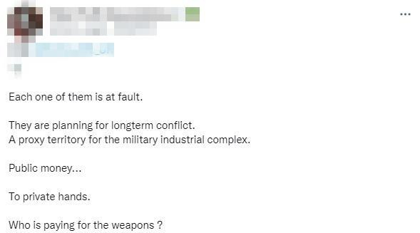 还有网友评论说,“他们正在为长期冲突做准备……谁在为这些武器买单?”