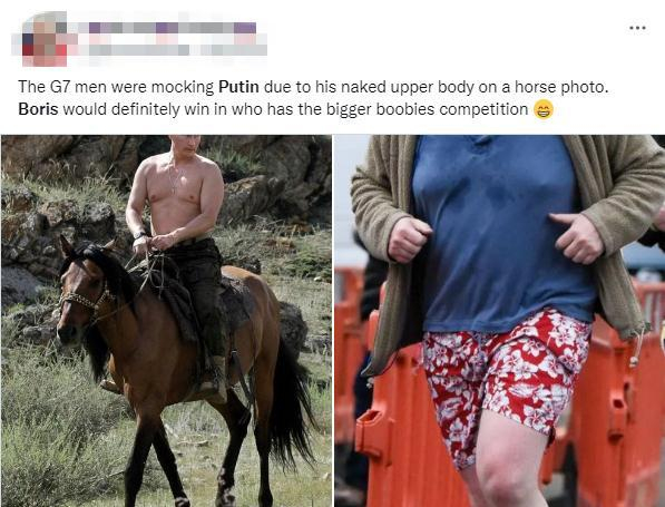 一些网友晒出了约翰逊和普京的对比照,说g7领导人“嘲笑普京的赤膊骑马照,但约翰逊一定会胜利,因为他的胸肌更大。”