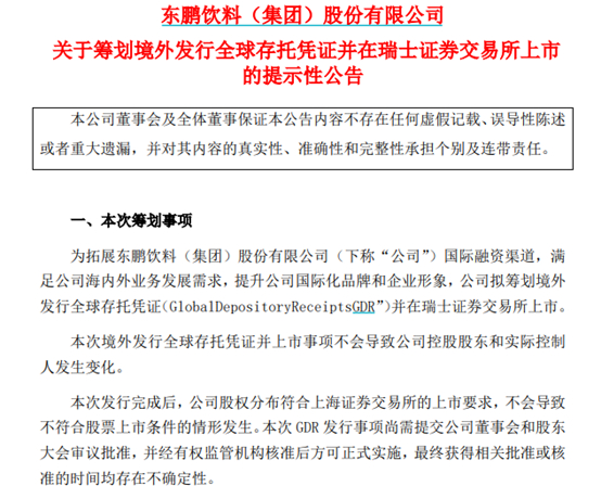 6月29日晚,东鹏饮料公告称,为拓展公司国际融资渠道,满足公司海内外业务发展需求,提升公司国际化品牌和企业形象,公司拟筹划境外发行全球存托凭证并在瑞士证券交易所上市。