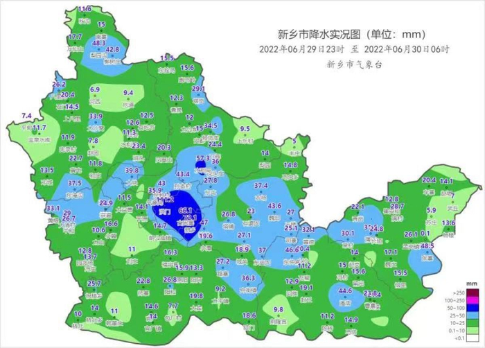 6月30日凌晨,新乡市全区出现雷阵雨,局部伴有雷暴大风、短时强降水等强对流天气。雨量分布不均,截至6月30日6:30,最大降雨量出现在红旗区洪门111.2毫米。全市共有54个站出现小时雨量大于20毫米的短时强降水,最大小时雨强104.6毫米(红旗区洪门01:00-02:00)。