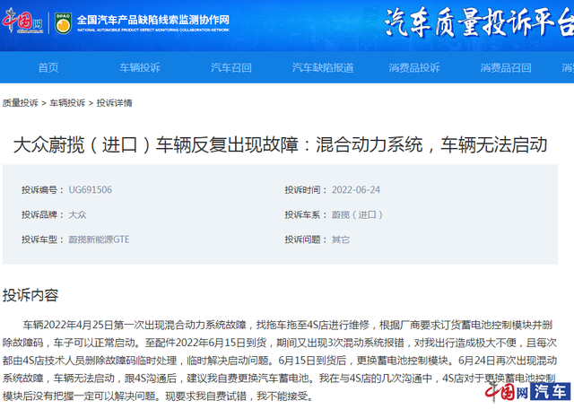 中国网汽车6月30日讯 (记者 王忆东)近日,中国网汽车质量投诉平台(https://315.auto.china.com.cn/zlts.html)接到一位大众蔚揽新能源GTE车主有关车辆混合动力系统故障的投诉。车主李先生表示,自己的车于2020年4月份在湖北省武汉市德宸进口大众购买,第一次出现混合动力系统故障是在今年4月份:“车辆当时出现无法启动的情况,我只能自己找拖车拖到4S店进行维修。”根据厂商要求,车辆需要更换蓄电池控制模块,并于当天订货。“4S店当时是帮我删除了车辆故障码,临时解决了问题,车子才可以正常启动。”