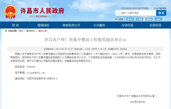6月29日,经基层单位民主推荐、逐级审查把关,许昌市发布户外广告集中整治拟奖励的个人及集体名单予以公示,公示时间为2022年6月29日至7月5日。