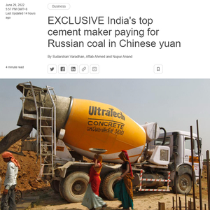 据路透社报道,印度最大水泥厂商超科集团,从俄罗斯西伯利亚煤炭能源公司购买了价值约1.72亿人民币的煤炭,本次交易是以人民币进行支付。