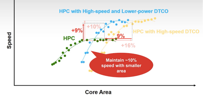 除了提高性能,也可以使用DTCO获得更低的功耗。台积电可以保持10%的性能提升,但面积更小,功耗还可以降低15%。面积减小有助于提升逻辑密度,由于导线更短(R 减小),也有助于提高性能。