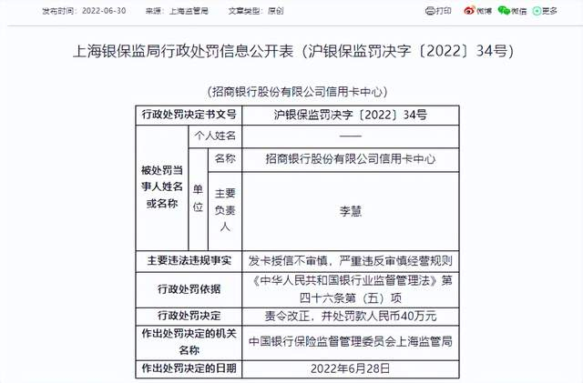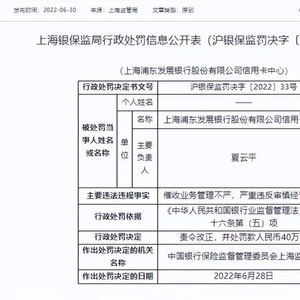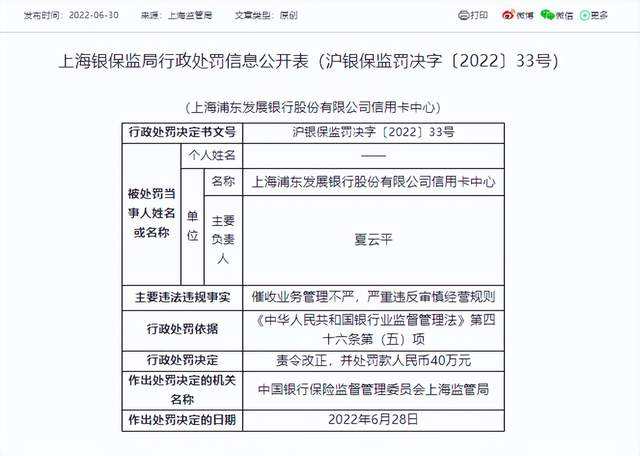 6月30日,上海银保监局发布的两则行政处罚信息公开表显示,浦发银行信用卡中心、招商银行信用卡中心因催收业务管理不严,严重违反审慎经营规则分别被罚款40万元。