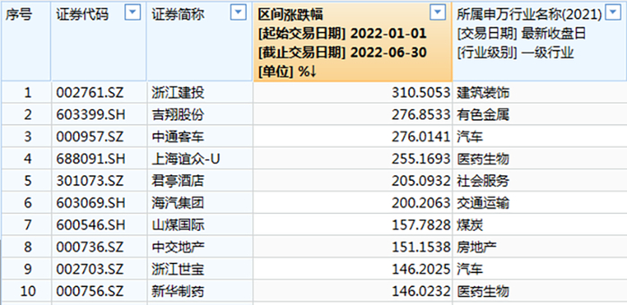 2022年上半年十大牛股正式出炉,剔除年内上市新股及ST股,浙江建投以310.51%的半年涨幅拔得头筹,吉翔股份、中通客车涨幅分列二、三位。值得注意的是,十大牛股中共有4只新能源概念股入围,另有两只医药股跻身其中。