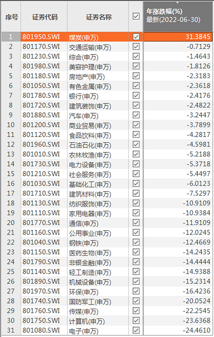 数据显示,今年上半年,申万31个一级行业中,煤炭一枝独秀,成为唯一上涨的板块,涨幅达到31.38%。其他行业悉数下跌,电子、计算机、传媒排名垫底,分别下跌了24%、23%和22%。