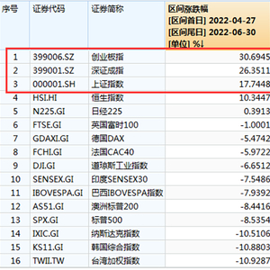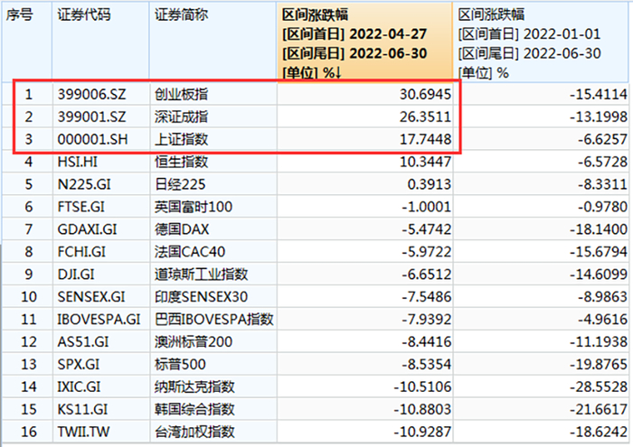 若以4月27日指数触底起算,上证指数过去两个多月自低点反弹17.74%,深证成指自低点反弹26.35%,创业板指自低点反弹30.69%。自4月底以来,A股三大股指在全球主要市场指数中表现高居前列,大幅跑赢欧美市场。