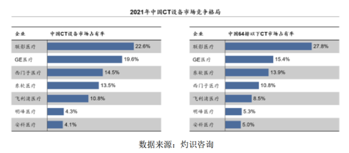 据灼识咨询数据,2021年中国CT设备市场占有率排名前五的分别为联影医疗、GE医疗、西门子医疗、东软医疗和飞利浦医疗,上述企业CT设备总市占率已超过80%,其中,联影一家占比超20%。