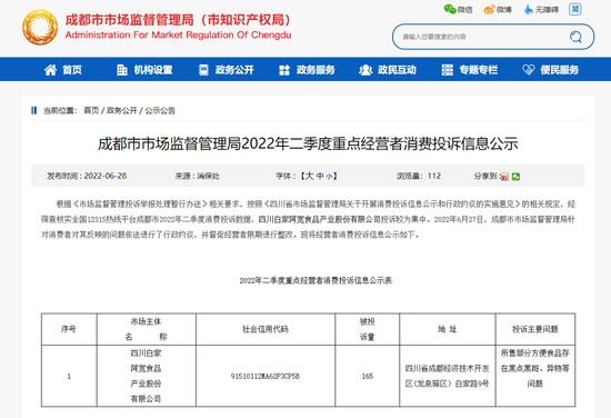 6月28日,成都市市场监督管理局发布的《2022年二季度重点经营者消费投诉信息公示》显示,经筛查核实全国12315热线平台成都市2022年二季度消费投诉数据,四川白家阿宽食品产业股份有限公司投诉较为集中,相关投诉量达165条,投诉的主要问题为“所售部分方便食品存在黑点黑斑、异物等”。